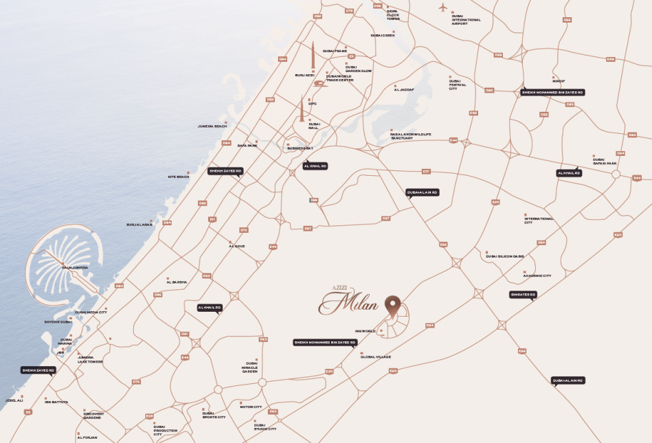 Azizi Milan is set to become a leading fashion and vibrant destination, amid the charm of modern Dubai. This chic locale is close to attractions like IMG World and Global Village, with easy access via E 311 (Sheikh Mohammed Bin Zayed Road and D 54 (Sheikh Zayed Bin Hamdan Al Nahyan Street), ensuring convenience for residents.